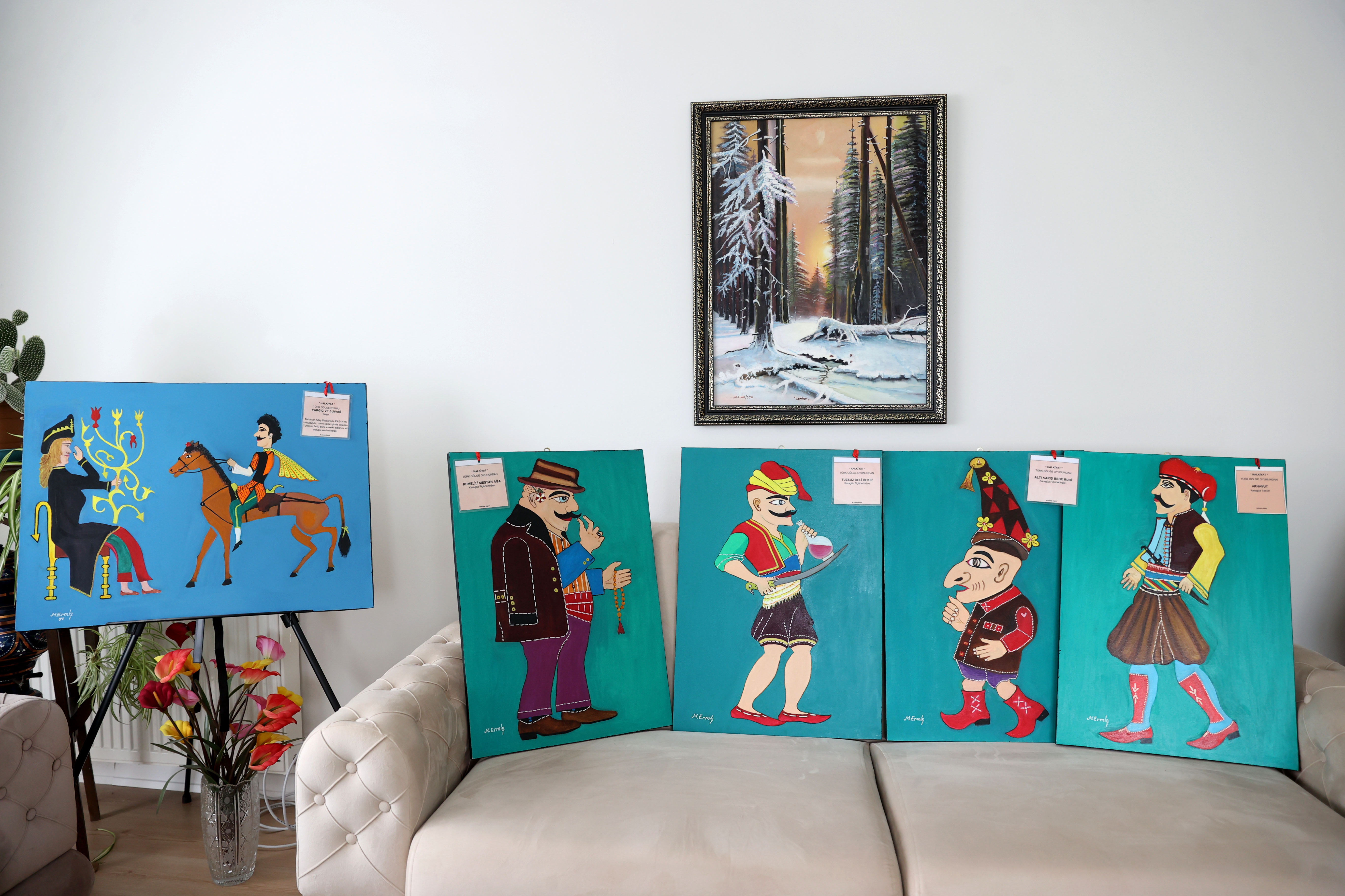Karagöz'e ayrı bir ilgisinin olduğunu belirten Ermiş, gölge oyunlarındaki 22 karakteri minyatür tarzda tuvallere yansıttığını anlattı.