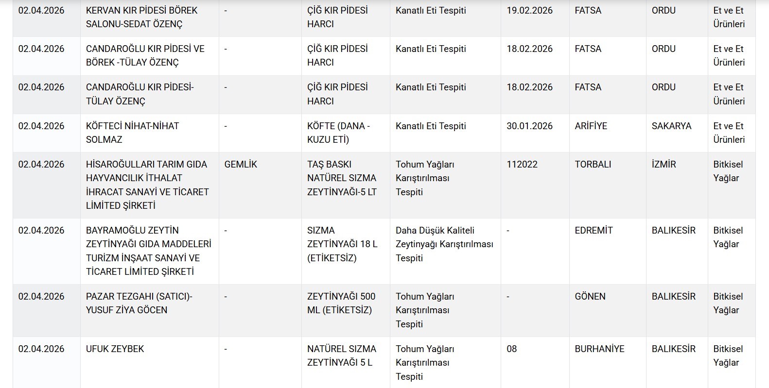 Et ürünlerinde de uygunsuzluklar dikkat çekti. İzmir’in Bornova ilçesinde Fatih Koçyiğit’e ait ‘çağ kebabı (pişmiş ürün)’ içinde kanatlı eti, Antalya’nın Kepez ilçesinde faaliyet gösteren Volkan Et’e ait dana kıyma ürününde de kanatlı et tespit edildi. Diyarbakır Kayapınar’da faaliyet gösteren işletmelerden Miran Lahmacun’a ait çiğ lahmacun harcında sakatat (karaciğer), Toki Ocakbaşı’nda ise kanatlı et bulundu. Kayapınar’daki Müptela Ocakbaşı çiğ kıyma harcında kanatlı et ve taşlık, Goşto Izgara çiğ Adana kebabı harcında ise kanatlı et ve taşlık saptandı. İstanbul’un Bağcılar ilçesinde faaliyet gösteren Tertip Et’e ait dana kıymada kanatlı et ve taşlık, Kartal’daki Okyanus Lezzet Toplu Yemek Hizmeti’ne ait fırınlanmış kasap köftede deri dokusu tespit edildi. İzmir Bornova’da Gürman Pide’ye ait çiğ dana etli lahmacun harcında sakatat (kalp) bulundu. Ordu Fatsa’da faaliyet gösteren Kervan Kır Pidesi Börek Salonu ve Candaroğlu Kır Pidesi ve Börek çiğ kır pidesi harçlarında kanatlı et belirlendi. Sakarya Arifiye’de Köfteci Nihat’ın dana ve kuzu etinden yapılan köftelerinde de kanatlı et tespit edildi.