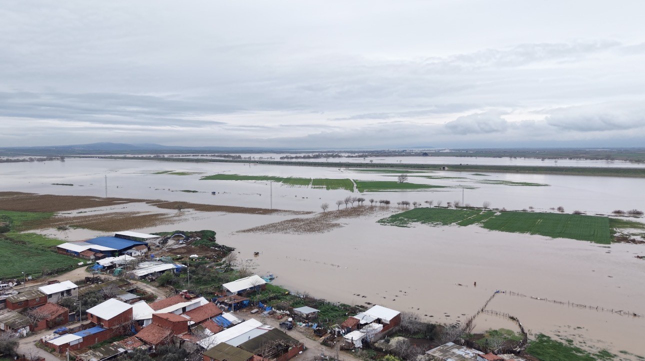 Dron ile kaydedilen görüntülerde, tarım arazilerinin büyük bölümünün suyla kaplandığı dikkat çekerken, taşkının boyutu havadan daha net şekilde ortaya kondu.