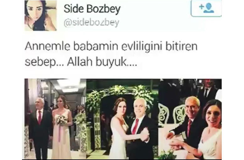 İlk eşinden bir kız çocuğu olan Mustafa Bozbey, eşini boşayıp, özel kalem çalışanıyla nikah masasına oturunca ilk tepkiyi bugün yapılan operasyonda gözaltına alınanlar arasında bulunan kızı Side Bozbey'den aldı. Side Bozbey, sosyal medya hesabından babası ve yeni eşi Seden Baştimur'un düğün fotoğraflarını paylaşarak, "Annemle babamın evliliğini bitiren sebep... Allah Büyük..." cümleleriyle sitemini dile getirdi.