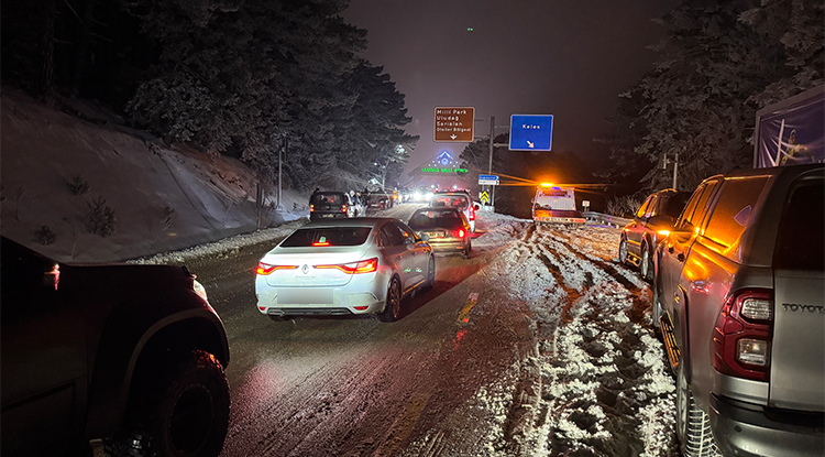 Kar yağışının ardından Uludağ’a adeta akın başladı. Milli Park gişelerinden her 10 saniyede bir araç geçerken, jandarma ekipleri trafik güvenliğini titizlikle sağladı.