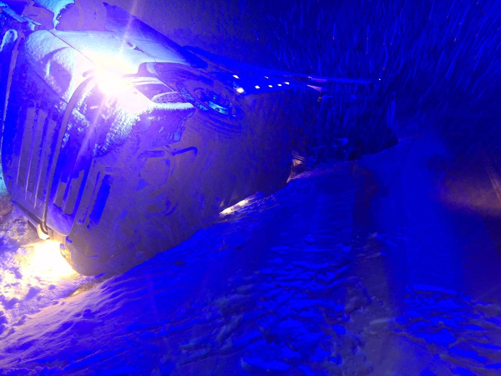 Bilecik'te seyir halinde kar yağışta kayan tır devrildi, sürücü yaralandı.