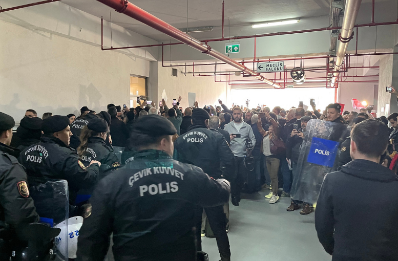 Bursa Büyükşehir Belediye Başkanı Mustafa Bozbey'in tutuklanması ve İçişleri Bakanlığı tarafından görevden uzaklaştırılmasının ardından bugünkü mecliste yeni başkanvekili seçilecek. Ancak saat 11'de yapılacak seçim öncesi belediye binasında olaylar çıktı. Polis yoğun güvenlik tedbiri alırken, meclis üyeleri haricinde kimsenin içeriye girmesine izin verilmedi. Meclis toplantısını takip etmek isteyen 200 kişilik CHP'li grup bariyerleri aşıp camları kırarak belediye binasına girdi. Arbede yaşandı. Polis içeri girenlere müdahale etti.