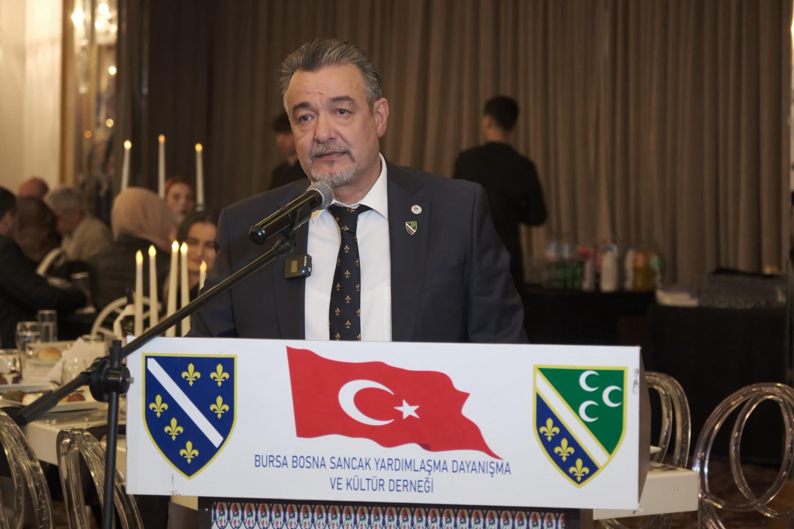 Gecenin açılış konuşmasını yapan Bursa Bosna Sancak Derneği Başkanı Sadık Şengül, derneğin 21 yıllık birikimine vurgu yaparak, “21 yıldır titizlikle yaşattığımız birlik, kardeşlik ve kültürel dayanışma ruhunu tazelemek için bir araya geldik. Bizler; Bosna’dan Sancak’a, Drina’dan Vardar’a kadar uzanan o geniş gönül coğrafyamızın ruhunu, Bursa’mızın maneviyatıyla harmanlamanın gururunu yaşıyoruz. Derneğimizin temel misyonu; atalarımızdan miras kalan değerleri, kentimize ve ülkemize birer erdem olarak sunmaktır. Bilge Kral Aliya İzzetbegoviç’in dediği gibi; 'Yeryüzünün öğretmeni olabilmek için, gökyüzünün öğrencisi olmak gerekir.' Bizler de köklerimizden aldığımız dersle, geleceğe umutla ve özgüvenle yürüyoruz. Bursa’nın sanayisinden ticaretine her alanda alın teriyle değer katan bir topluluğuz.” dedi.