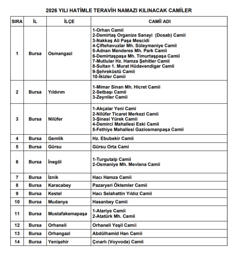 Bursa İl Müftülüğü, 2026 Ramazan ayı boyunca Bursa genelinde hatimle teravih namazı kılınacak camilerin listesini açıkladı.