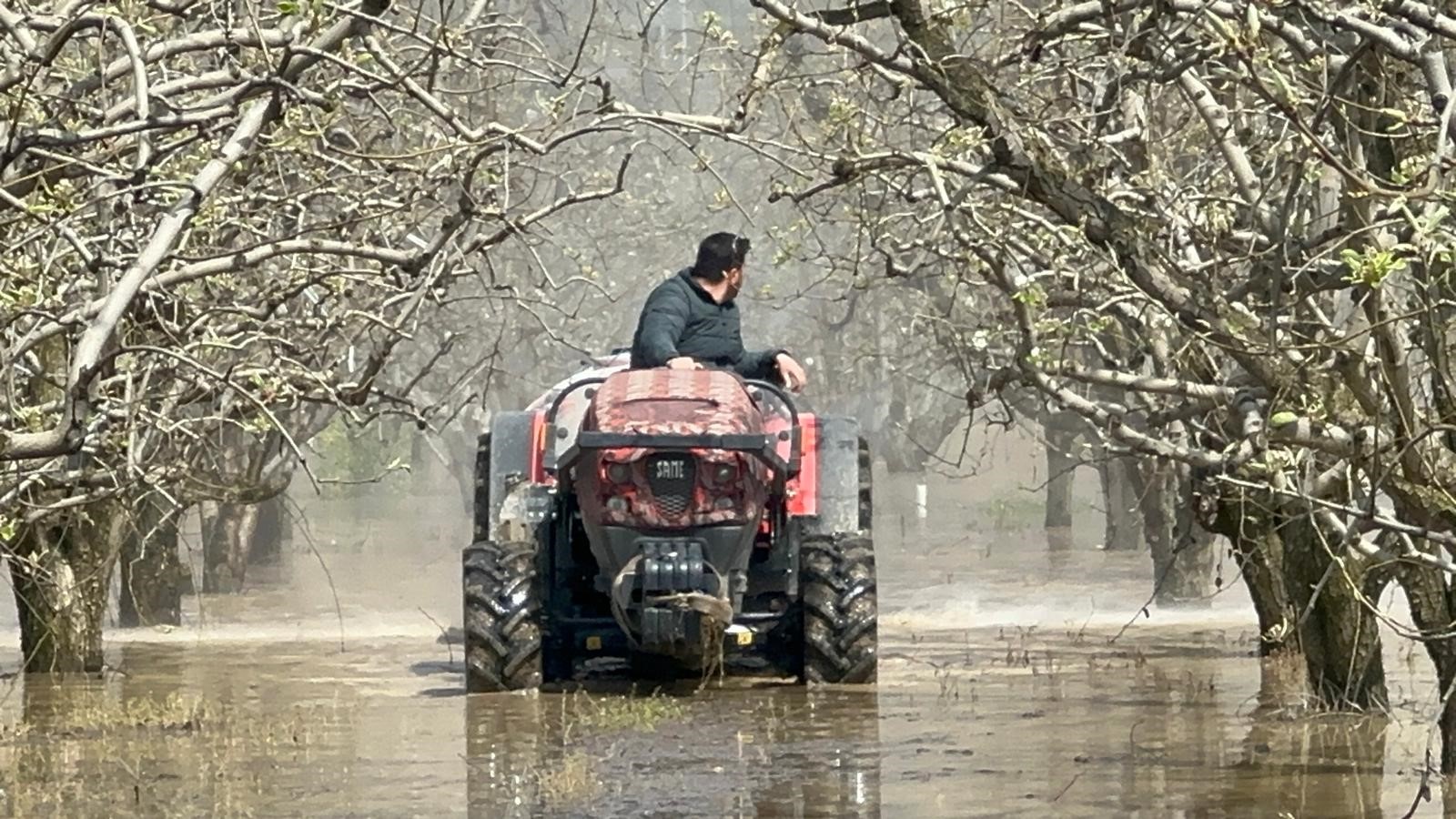 Armut bahçesine ilaçlama yapan üretici Turgay Koç ise yaşadıklarına zorluğa dikkati çekerek, "Traktörlere, bize, çiftçiye, meyve ağaçlarına yazık. 9 dönüm armut bahçemin büyük bölümü su altında. Bir hafta 10 gün su çekilmezse kurayacak. Önümüzdeki günler de yağışlı görünüyor, çaresisiz" diye konuştu.