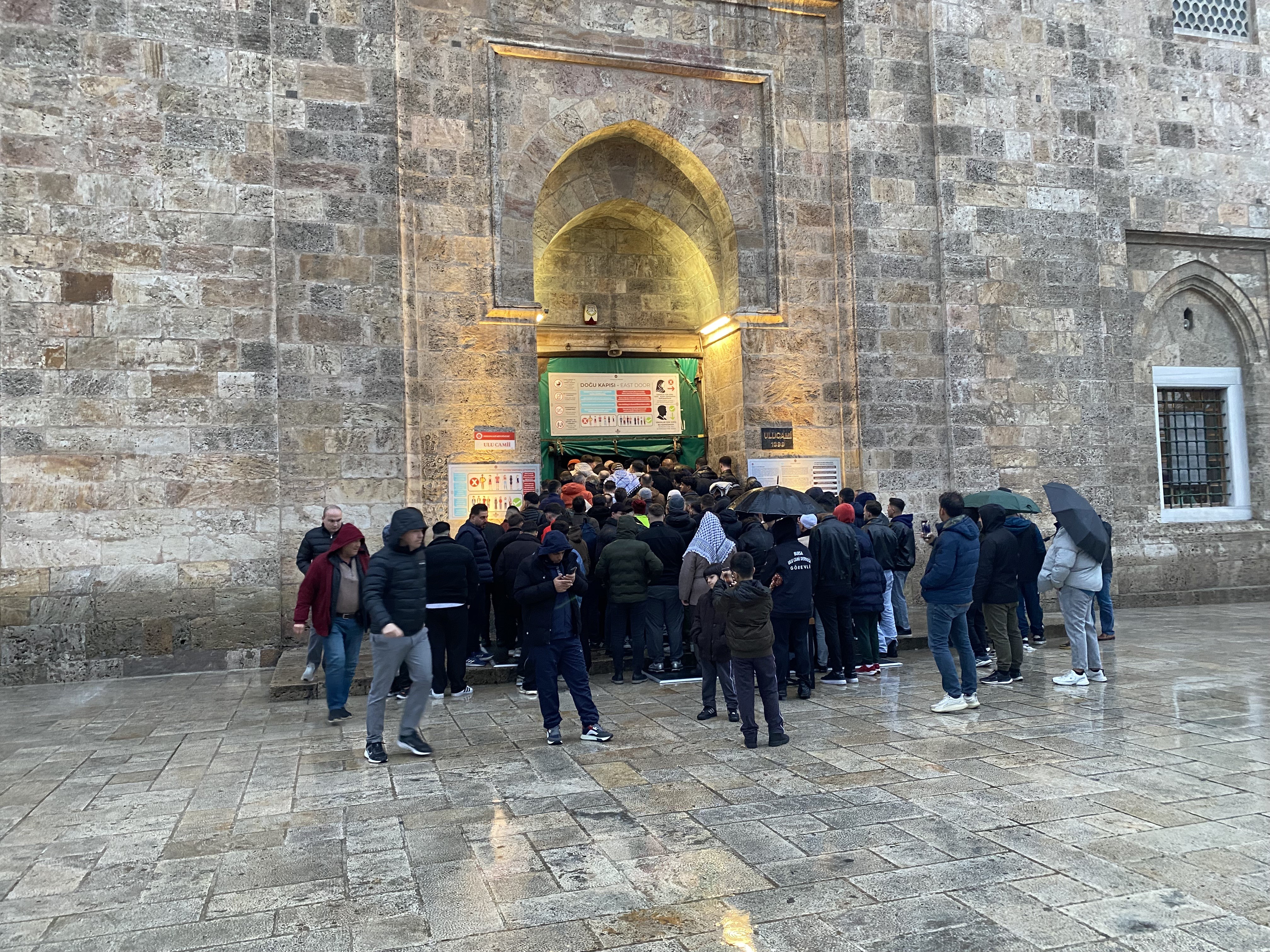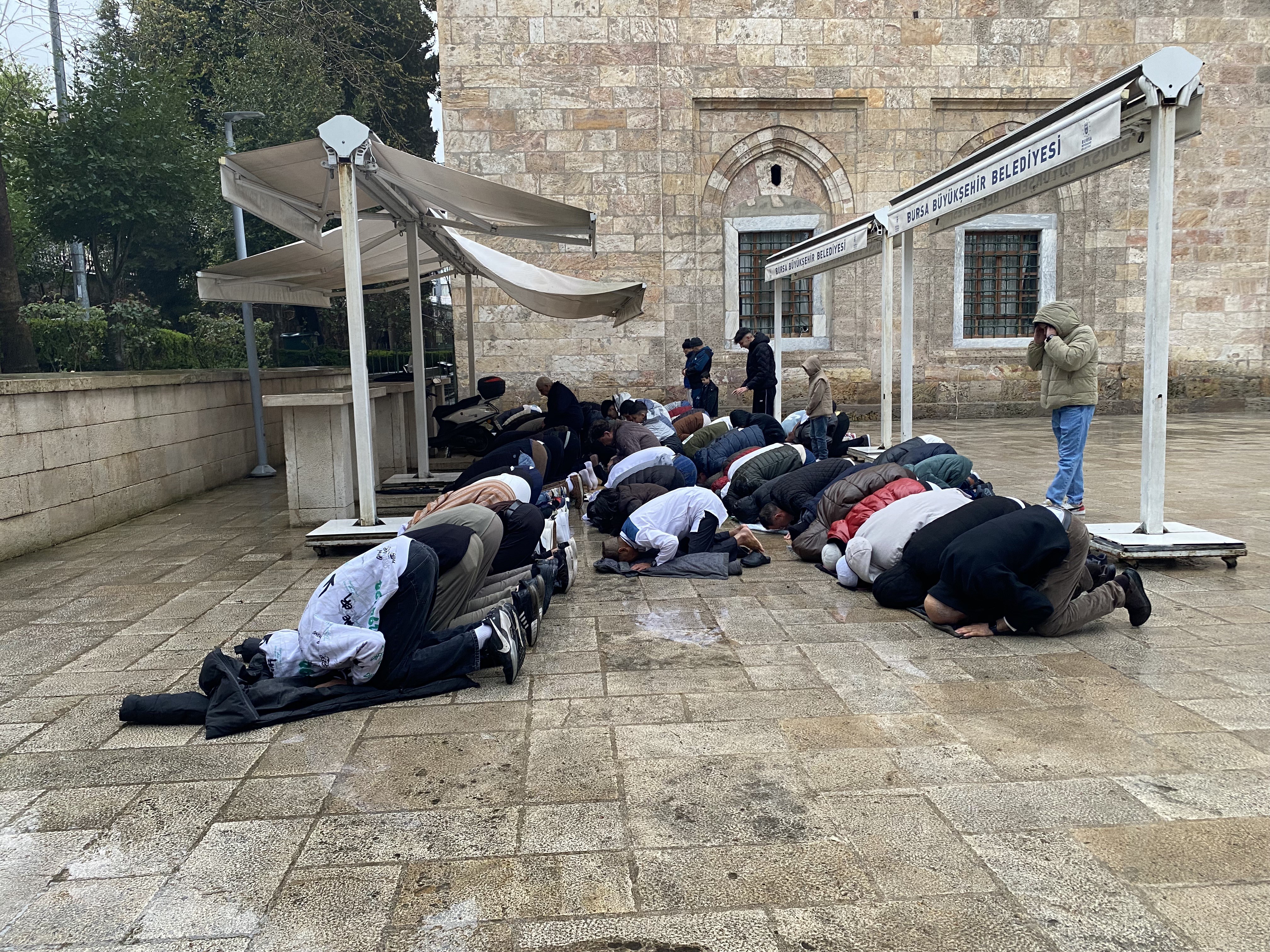 Sabahın erken saatlerinden itibaren Ulu Cami'ye gelen vatandaşlar, kısa sürede caminin içini doldurdu. Yoğunluk nedeniyle içeride yer bulamayan çok sayıda kişi, yağmura rağmen ibadetlerini avluda gerçekleştirdi.