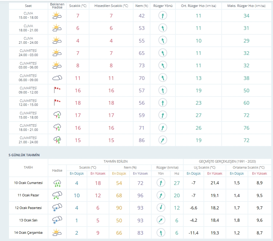 Cumartesi (10 Ocak): En düşük 4, en yüksek 18 derece. Kuvvetli rüzgar ve sağanak yağış.