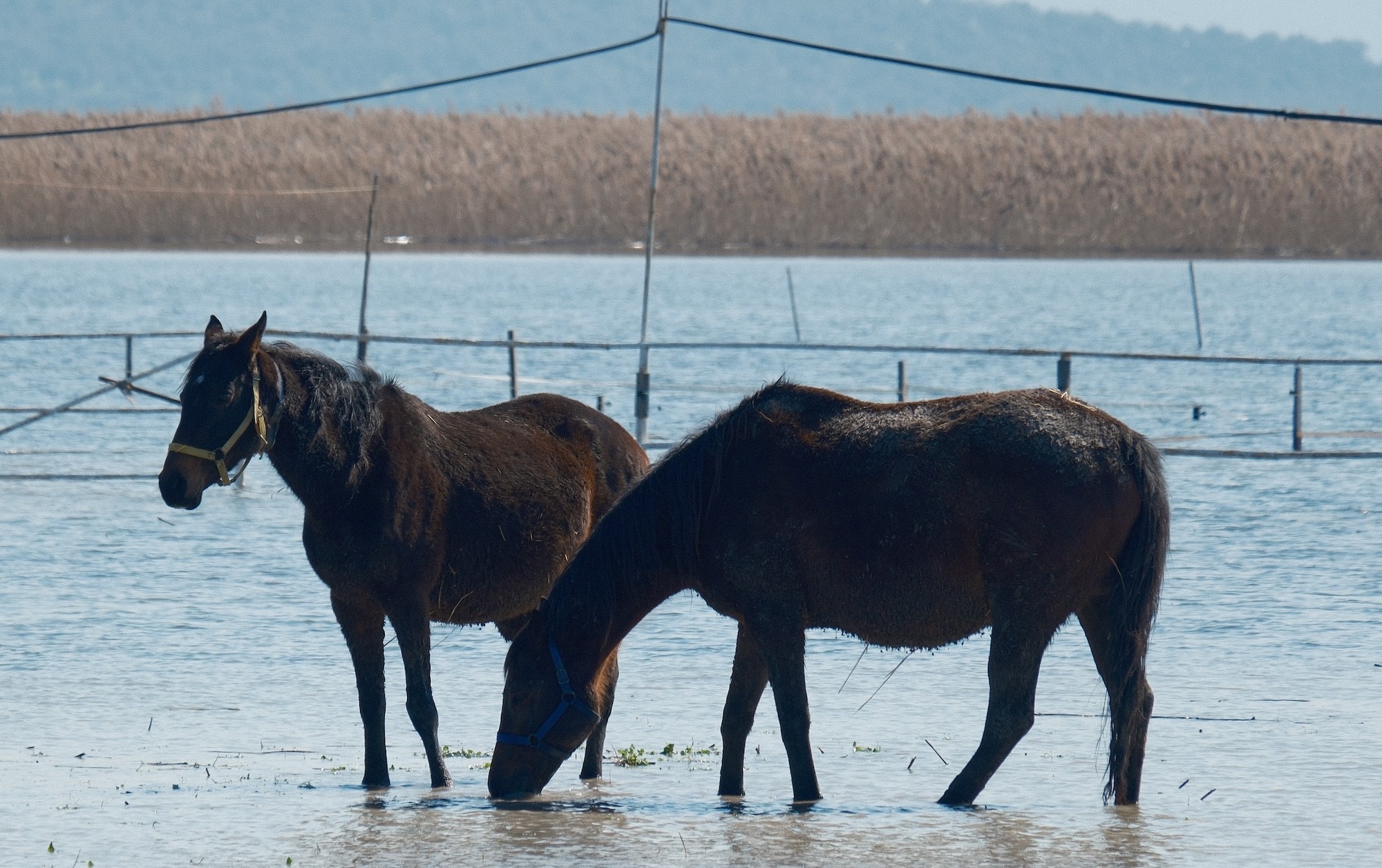 Bursa'nın Karacabey ilçesindeki Uluabat Gölü'ne yakın milyonluk yarış atlarının bulunduğu tavlalar su altında kaldı. Atlar, su içinde gezinirken drone ile görüntülendi.