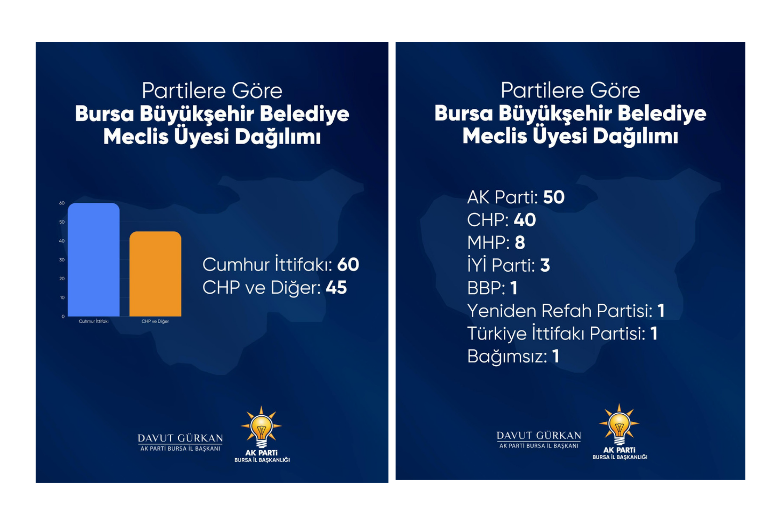 Davut Gürkan, sosyal medya hesabından yaptığı açıklamada, millet iradesine saygı çağrısında bulunarak Bursa Büyükşehir Belediye Meclisi’ndeki aritmetiğe işaret etti. Gürkan, Cumhur İttifakı’nın çoğunlukta olduğunu belirterek, ortaya çıkan tablonun yok sayılmaması gerektiğini ifade etti.