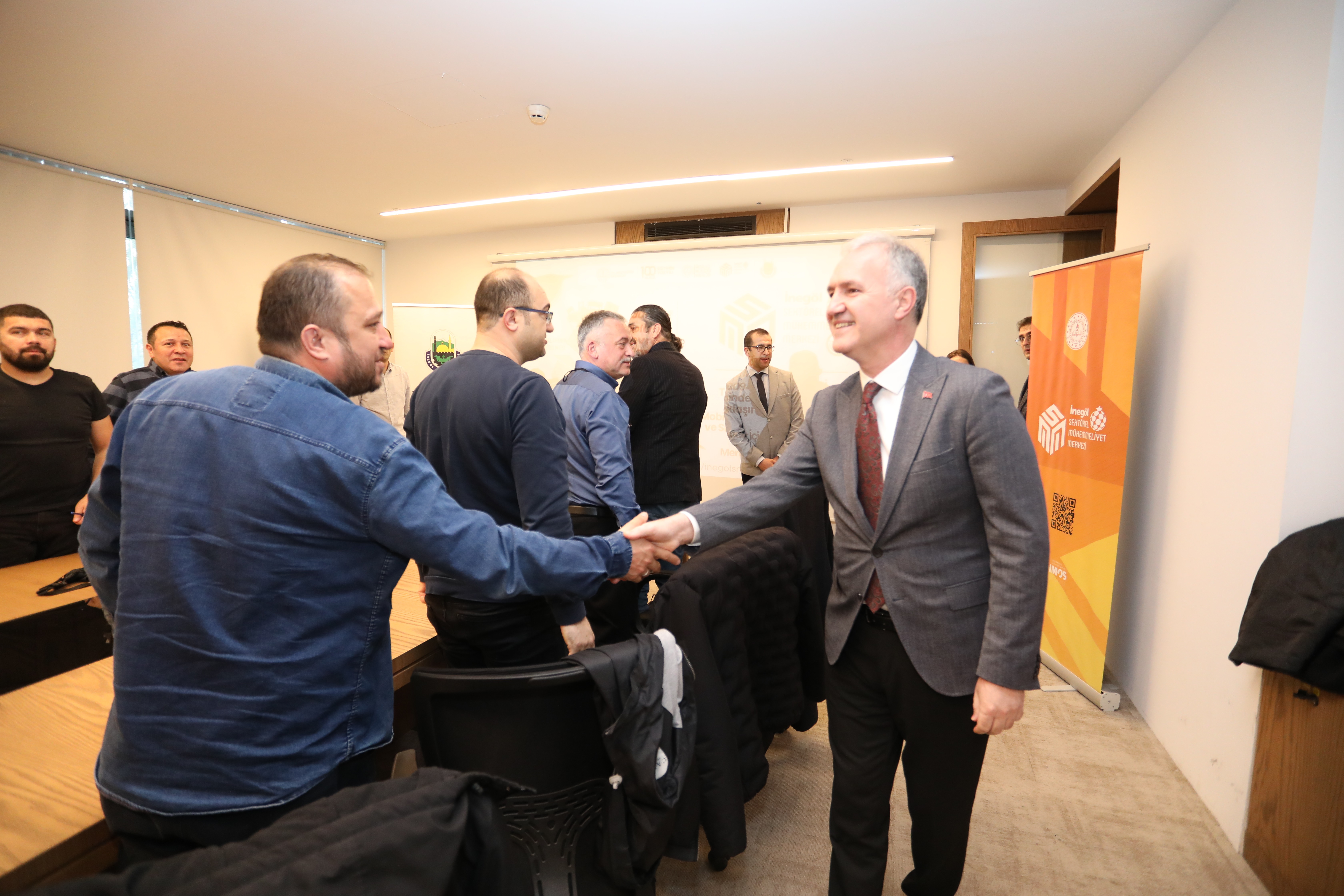 İnegöl Belediyesi binası encümen salonunda yapılan eğitim programının ilk gününde, farklı şehirlerden gelen mobilya bölümü öğretmenleriyle birlikte; İnegöl Belediye Başkanı Alper Taban, Milli Eğitim Merkezi Müdürü Halil İbrahim Zengin, Sektörel Mükemmeliyet Merkezi Koordinatörü Ali Akkoç, Mobilyacılar Odası Başkanı Yasin Altuntepe de hazır bulundu. Eğitim programının başlangıcında kısa bir konuşma yapan Sektörel Mükemmeliyet Merkezi Genel Koordinatörü Ali Akkoç, 2026 yılının Türkiye genelinde planlanan ilk hizmet içi eğitim programında önemli bir konuyu ele aldıklarını belirterek, “Mobilya atıklarının geri dönüştürülmesi konusunda belediyemizle birlikte güçlü bir program hazırladık. İnegöl’ün mobilya şehri kimliği bu çalışmayı daha da anlamlı kılıyor” dedi.