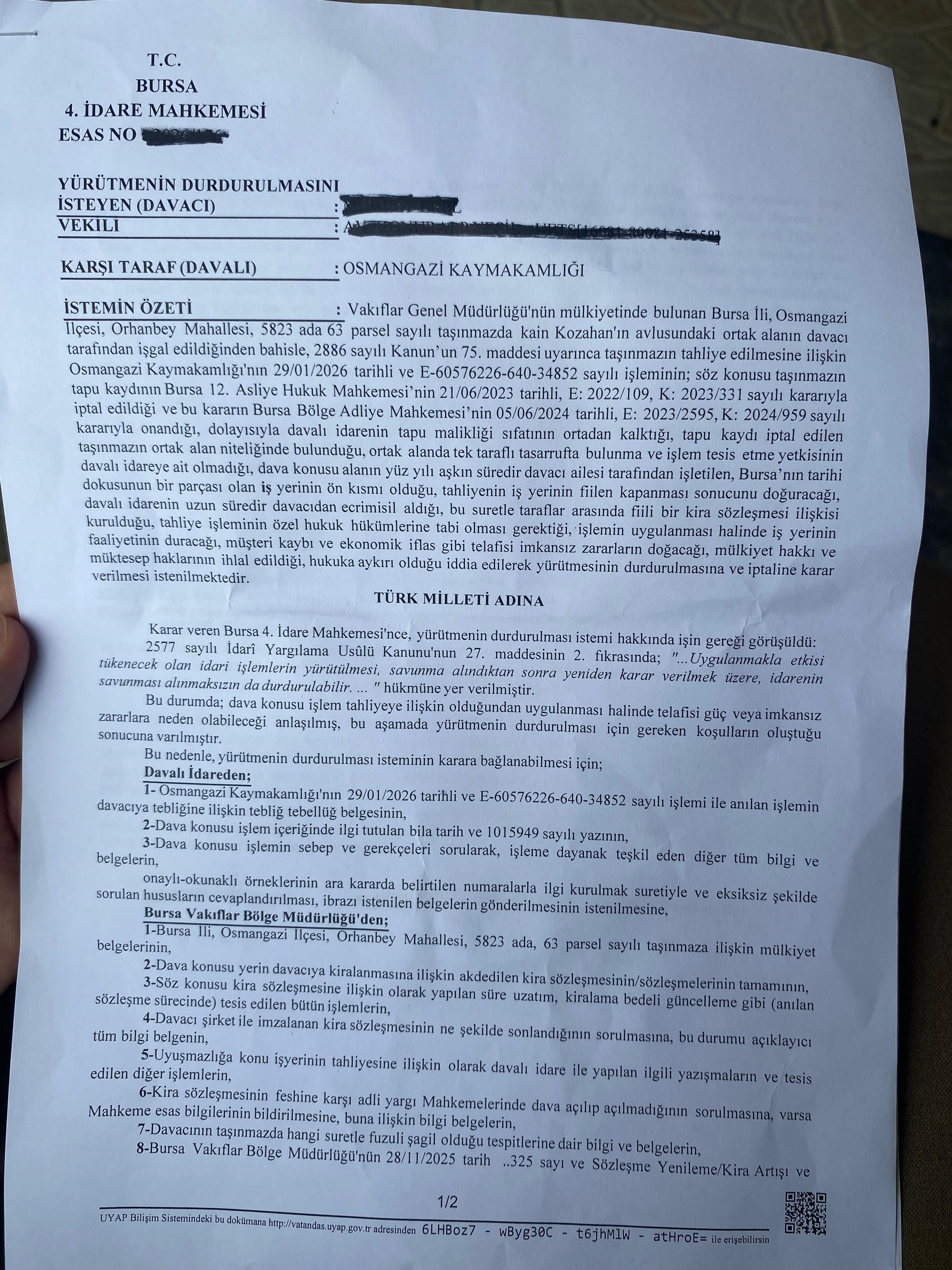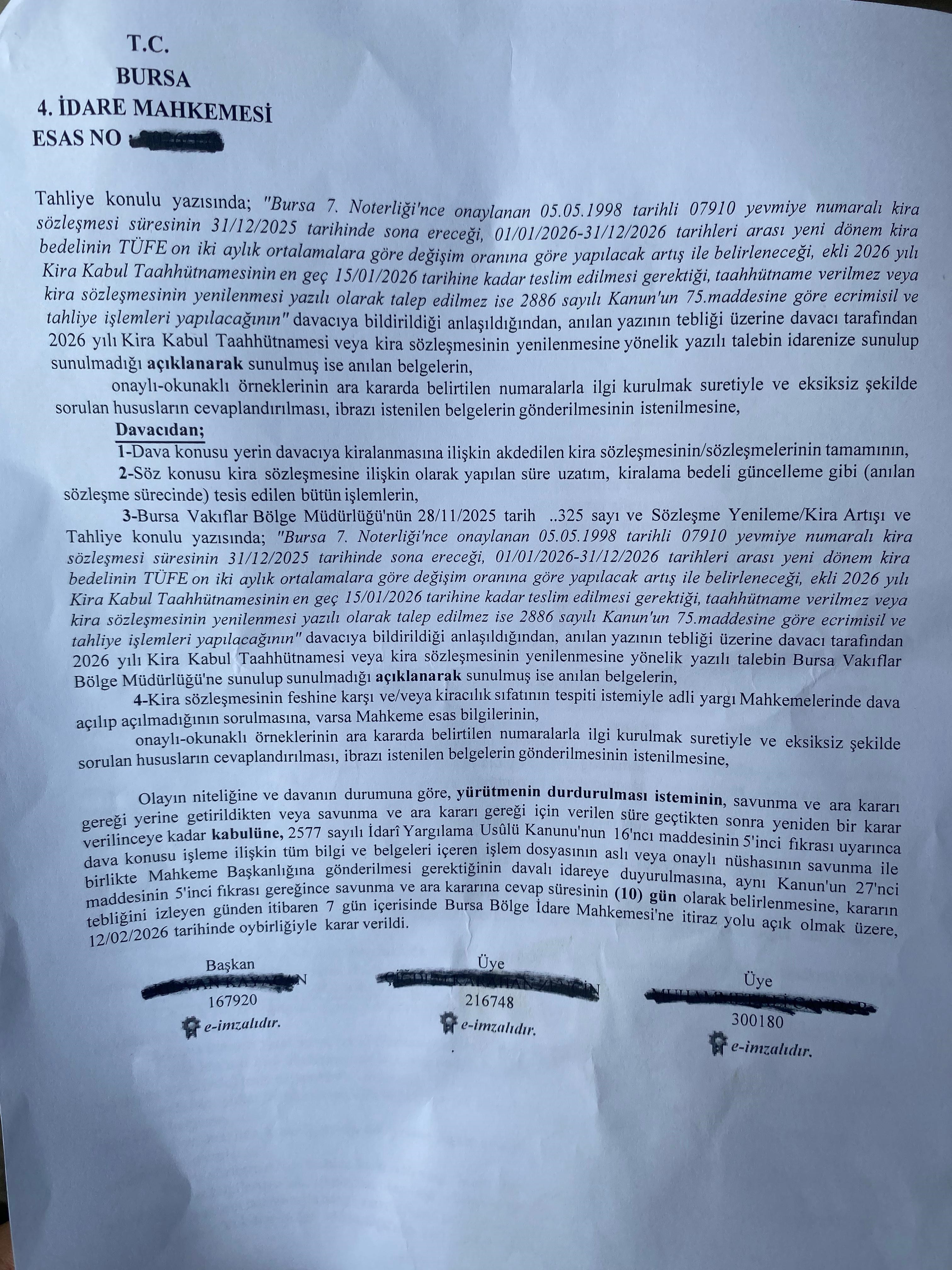Yargılama süreci kapsamında Bursa Vakıflar Bölge Müdürlüğü'nden, taşınmaza ilişkin mülkiyet belgeleri, kira sözleşmesi ve "fuzuli şagil" tespitine dair tüm evrakların gönderilmesi istendi. İdareye savunma için 10 günlük süre tanındı.