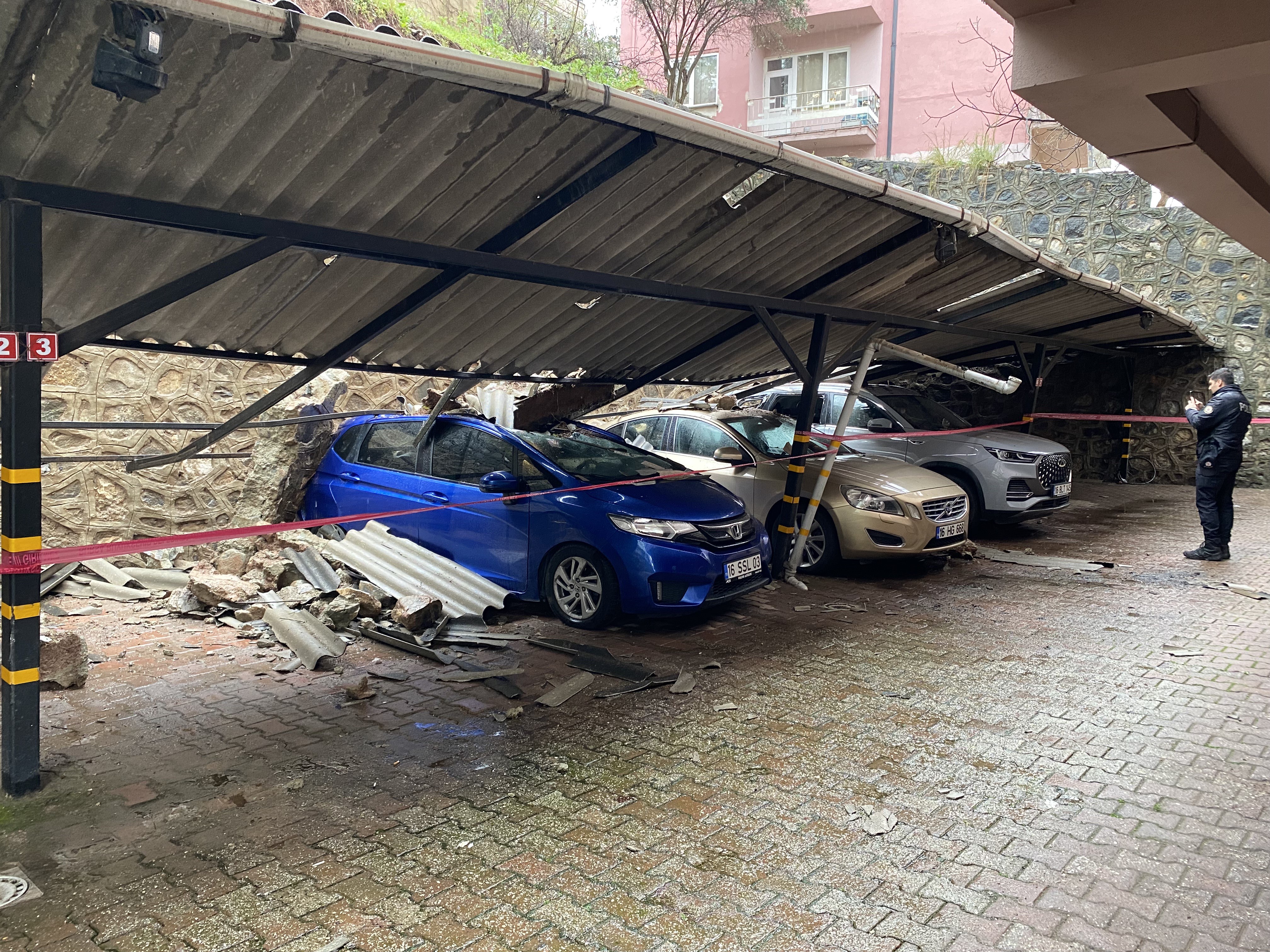 Bursa'da sağanak yağışla birlikte Uludağ'ın eteklerindeki Çekirge Mahallesi'nde bir apartmanın istinat duvarı çöktü. 3 lüks otomobil duvar altında kalarak ağır hasar gördü. Olayın sabaha karşı 5'te yaşanması muhtemel bir faciayı önledi. Gün ağarınca otoparka inen vatandaşlar, park halindeki araçların üzerine düşen taş parçalarını görünce kısa süreli şaşırma yaşadı.