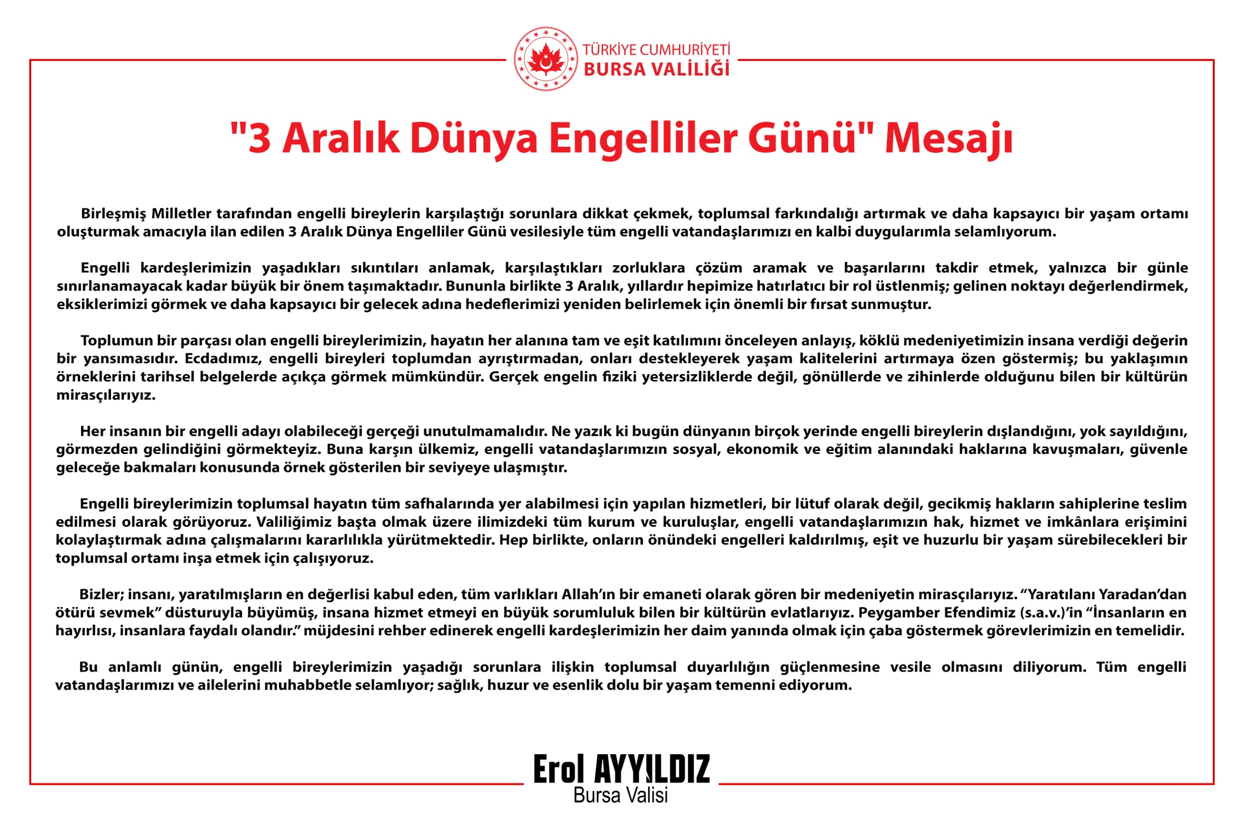 Türkiye Cumhuriyeti Bursa Valiliği ve Erol Ayyıldız tarafından 3 Aralık Dünya Engelliler Günü dolayısıyla yayımlanan mesajda, engelli bireylerin yaşadığı sorunlara dikkat çekilerek toplumsal farkındalığın önemine vurgu yapıldı.