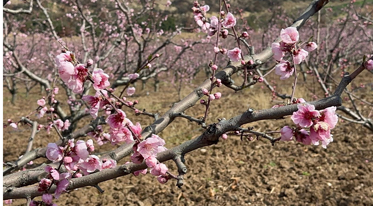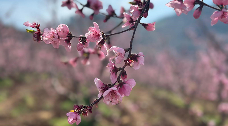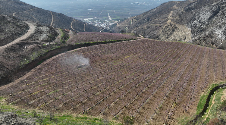 Yükseltilerin arasında, binlerce dekar griye çalan alanın ortasında göz kamaştırıcı bir manzara, bir umut isyanı yükseliyor. Yangının pençesinden sahiplerinin bakımları sayesinden kurtulan, dağların kuytusunda saklı 50 dönümlük şeftali bahçeleri, baharın gelişiyle pembe çiçeklere durdu ve büyüleyici bir görsel şölen sundu.