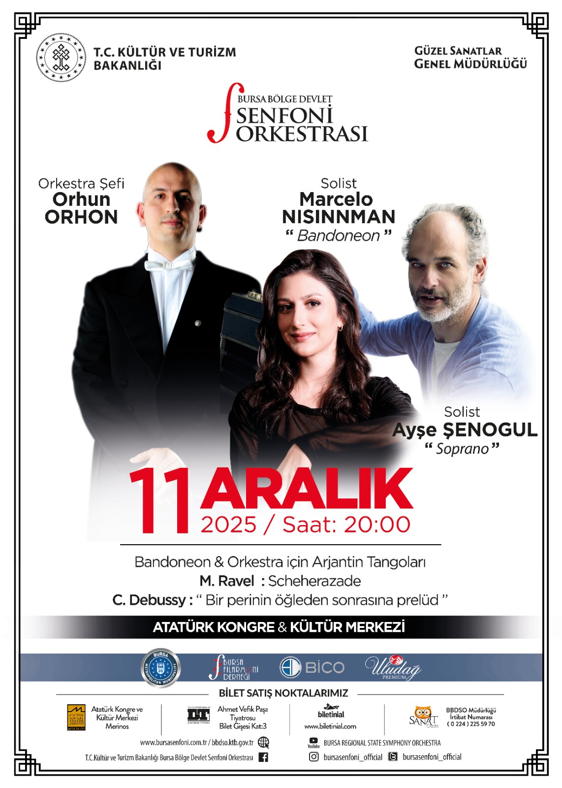 Bursa Bölge Devlet Senfoni Orkestrası (BBDSO), 11 Aralık 2025 Çarşamba akşamı saat 20.00'de Merinos Atatürk Kongre ve Kültür Merkezi Orhangazi Salonu'nda, Fransız müziğin başyapıtlarından Maurice Ravel’in "Shéhérezade" (Şehrazad) eserini ve Bandoneon & Orkestra için özel olarak düzenlenmiş Arjantin Tangolarını müzikseverlerle buluşturmaya hazırlanıyor.