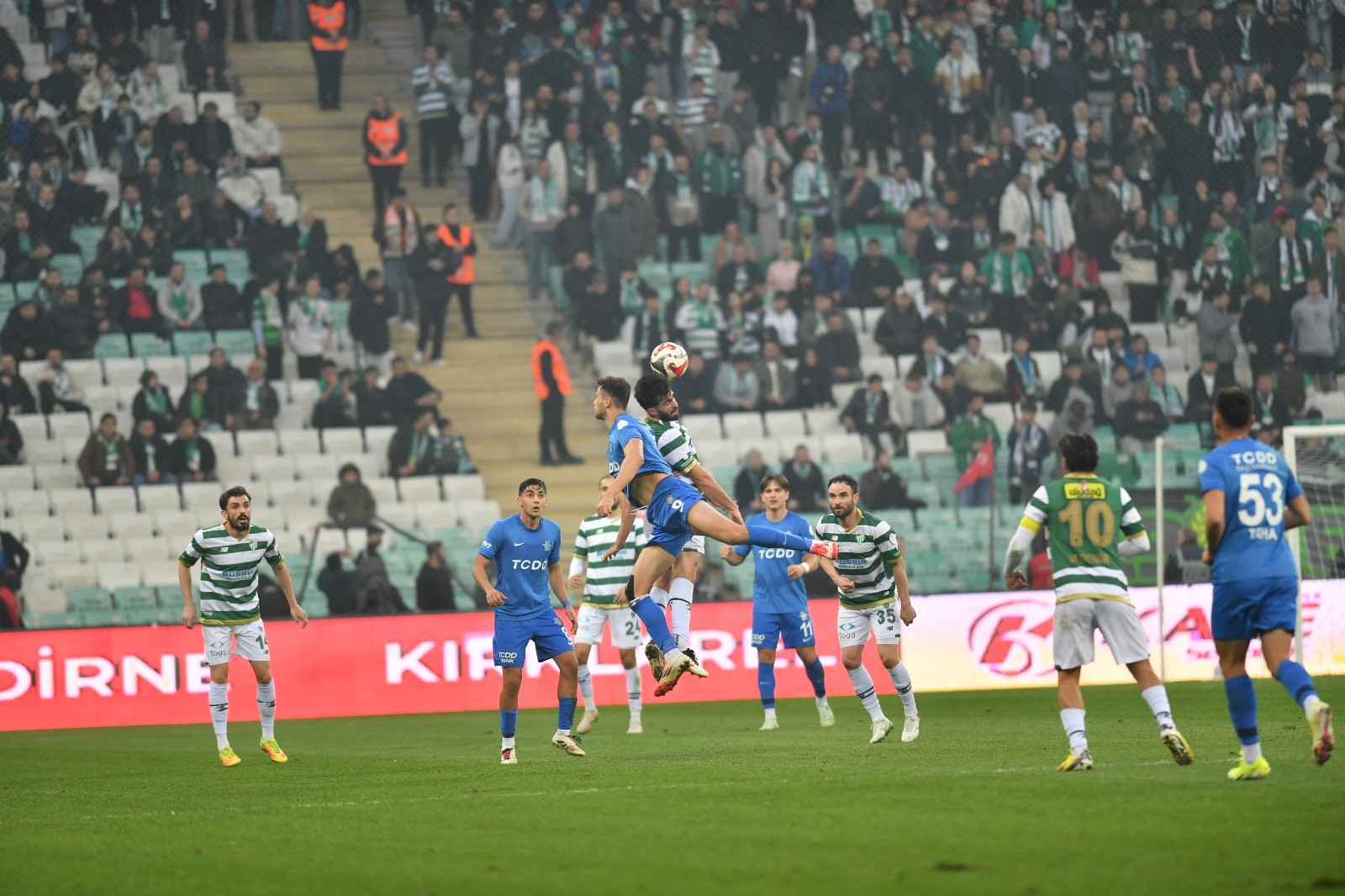 Hafta içi oynanmasına rağmen 30 bin 340 Bursasporlu taraftar tribünleri doldurdu. Yeşil-beyazlılar, 90 dakika boyunca takımlarına büyük destek vererek galibiyette önemli rol oynadı.